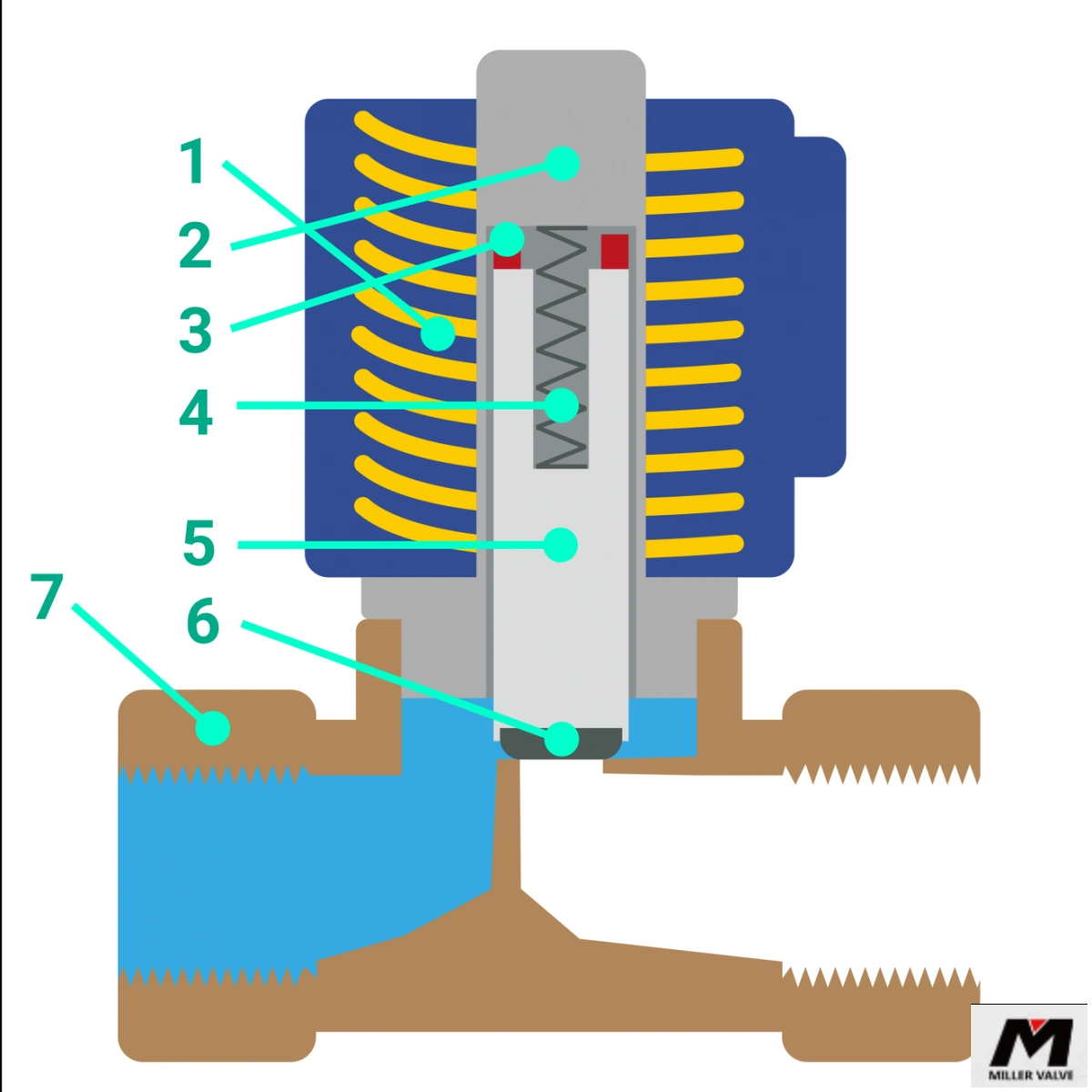 1)線圈 2)電樞 3)屏蔽環(huán) 4)彈簧 5)柱塞 6)密封 7)閥體